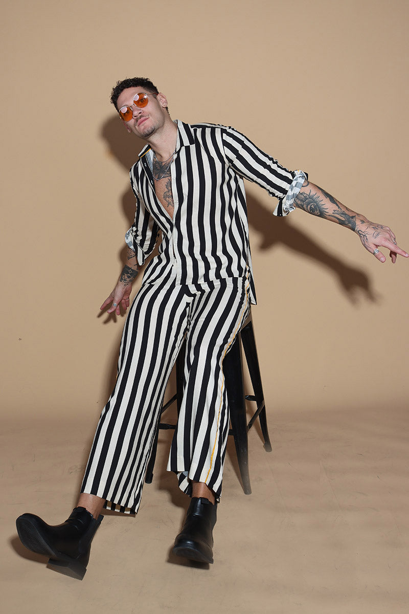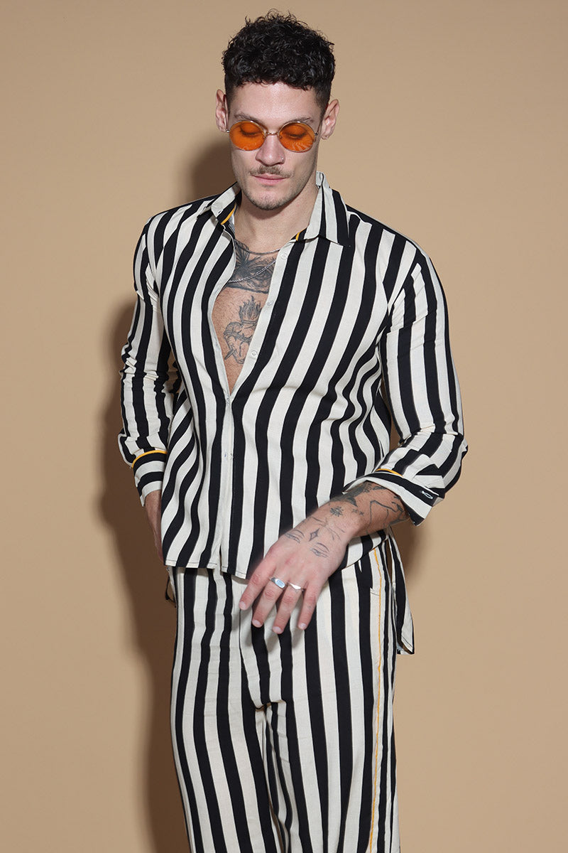 Das Ringo-Set aus weich drapierter Baumwolle verfügt über eine auffällige grafische Streifengrafik in Schwarz und Creme.